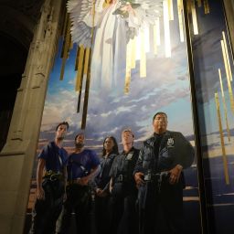 Cutline for featured image: Daniel Egan, left, pictured in a Dec. 12, 2024, photo, had a vision of a mural dedicated to St. Joseph the Worker, and after considered several potential locations before finding one on Gratiot Avenue, across from St. Joseph Shrine. Egan worked with Detroit artist Elton Duran, center, and assisting artists Mary Hodges, right, and Martina Sanroman (not pictured). (OSV News photo/Daniel Meloy, Detroit Catholic)